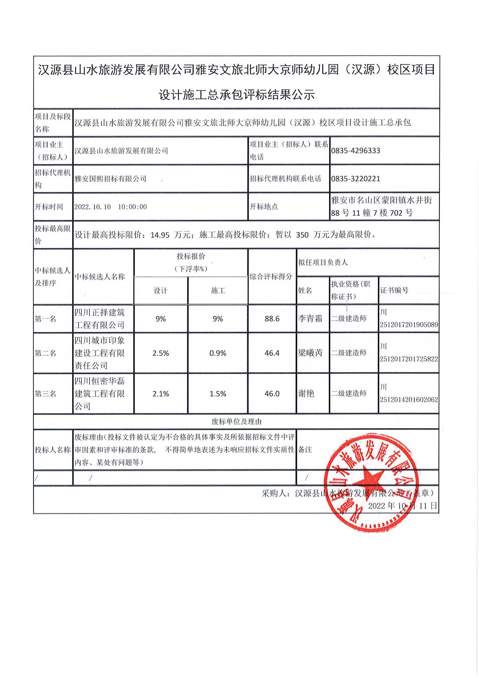 漢源縣山水旅游發(fā)展有限公司雅安文旅北師大京師幼兒園(漢源)校區(qū)項目設(shè)計施工總承包評標(biāo)結(jié)果公示