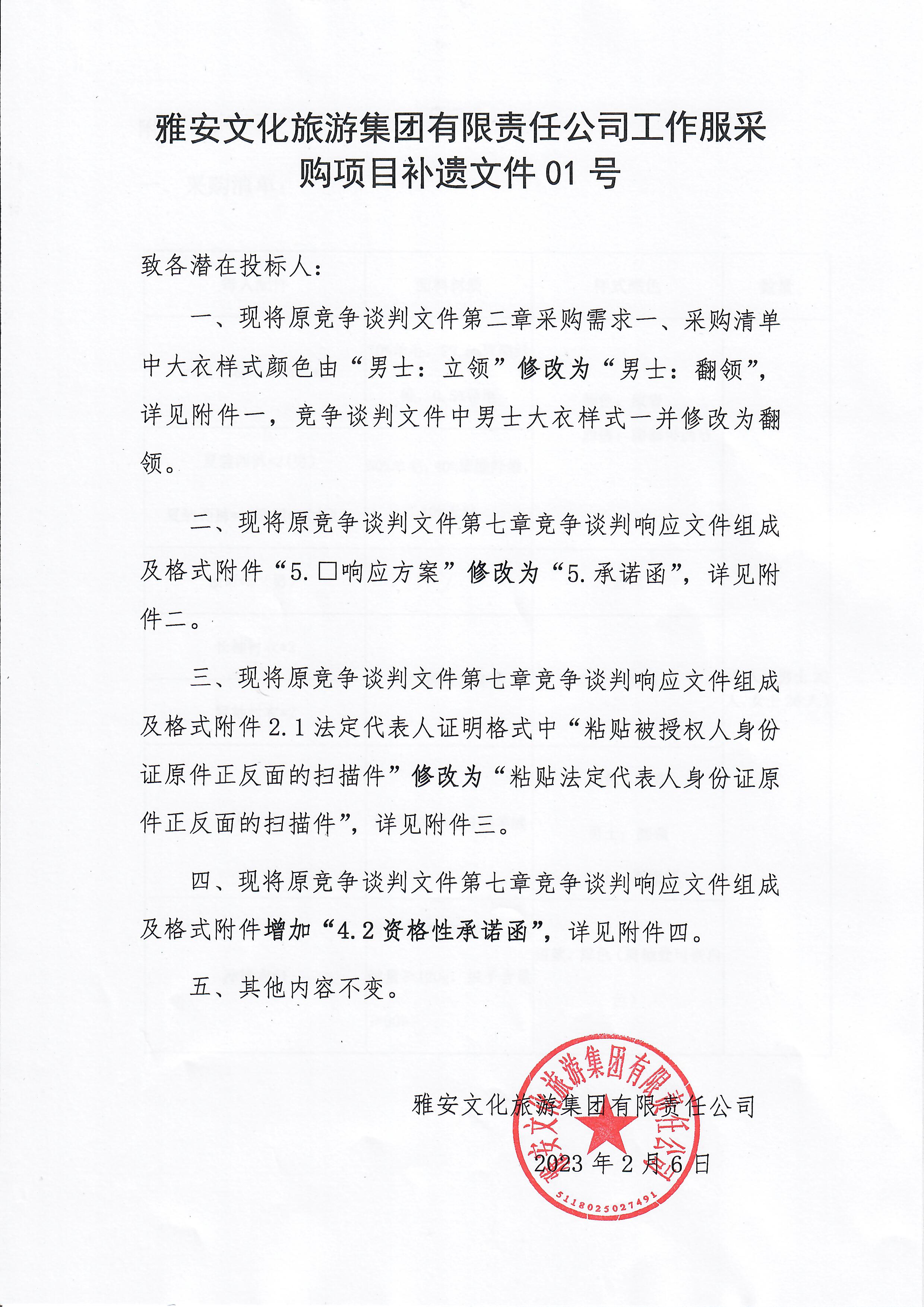 雅安文化旅游集團(tuán)有限責(zé)任公司工作服采購項(xiàng)目補(bǔ)遺文件01號(hào)