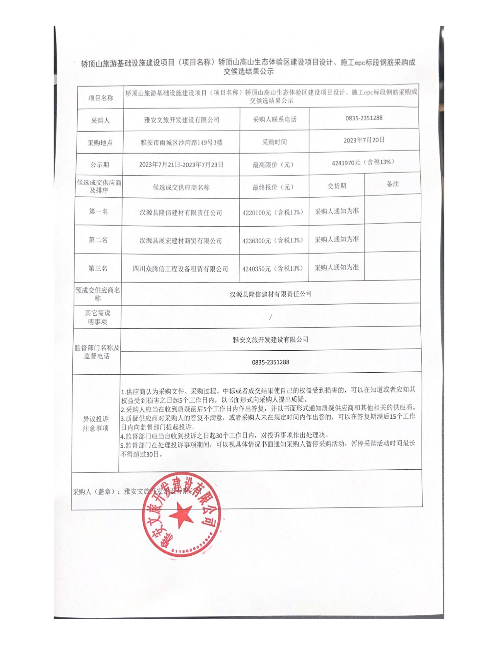 轎頂山旅游基礎(chǔ)設(shè)施建設(shè)項(xiàng)目(項(xiàng)目名稱)轎頂山高山生態(tài)體驗(yàn)區(qū)建設(shè)項(xiàng)目設(shè)計(jì)、施工epc標(biāo)段鋼筋采購候選結(jié)果公示