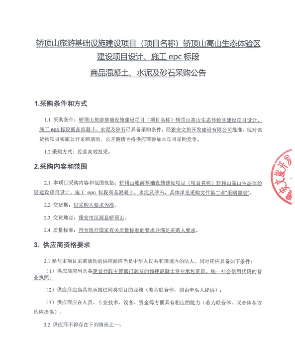 轎頂山旅游基礎(chǔ)設(shè)施建設(shè)項目 (項目名稱)轎頂山高山生態(tài)體驗區(qū)建設(shè)項目設(shè)計、施工epc標(biāo)段商品混凝土、水泥及砂石采購公告