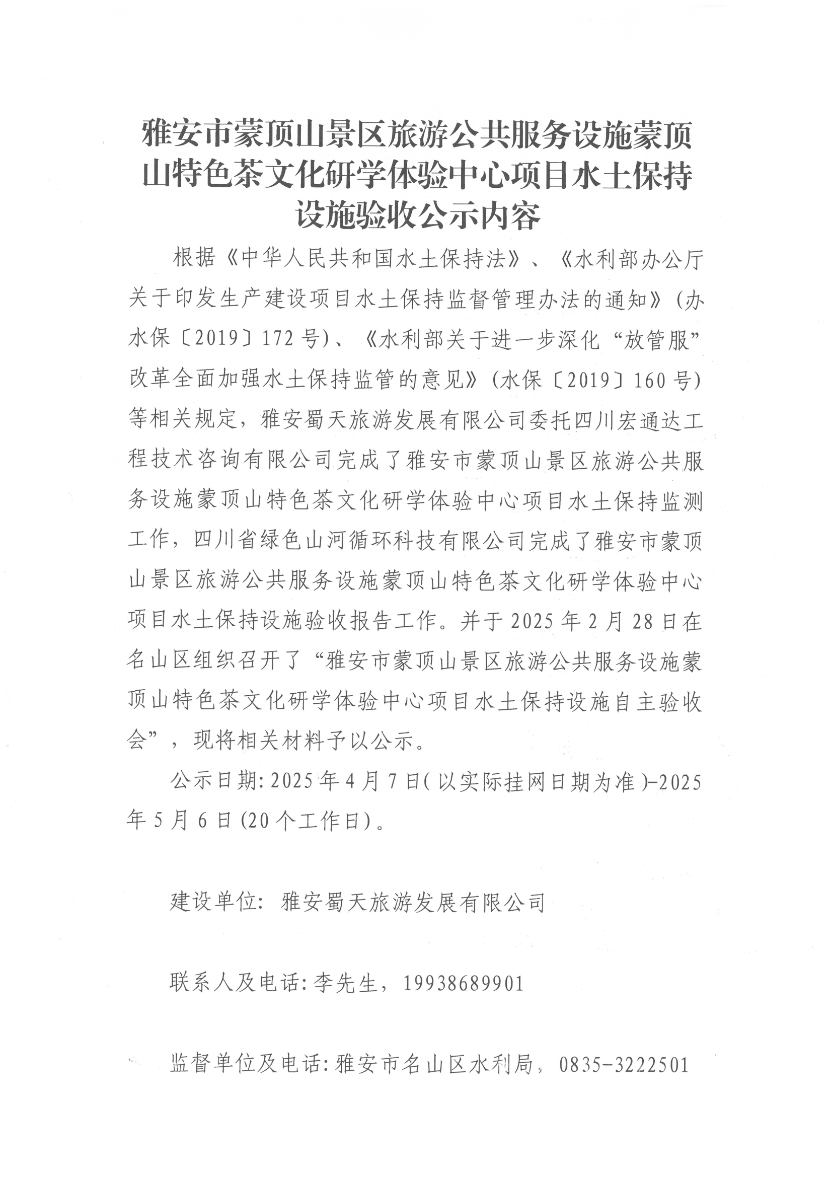 雅安市蒙頂山景區(qū)旅游公共服務設施蒙頂山特色茶文化研學體驗中心項目水土保持設施驗收公示內容